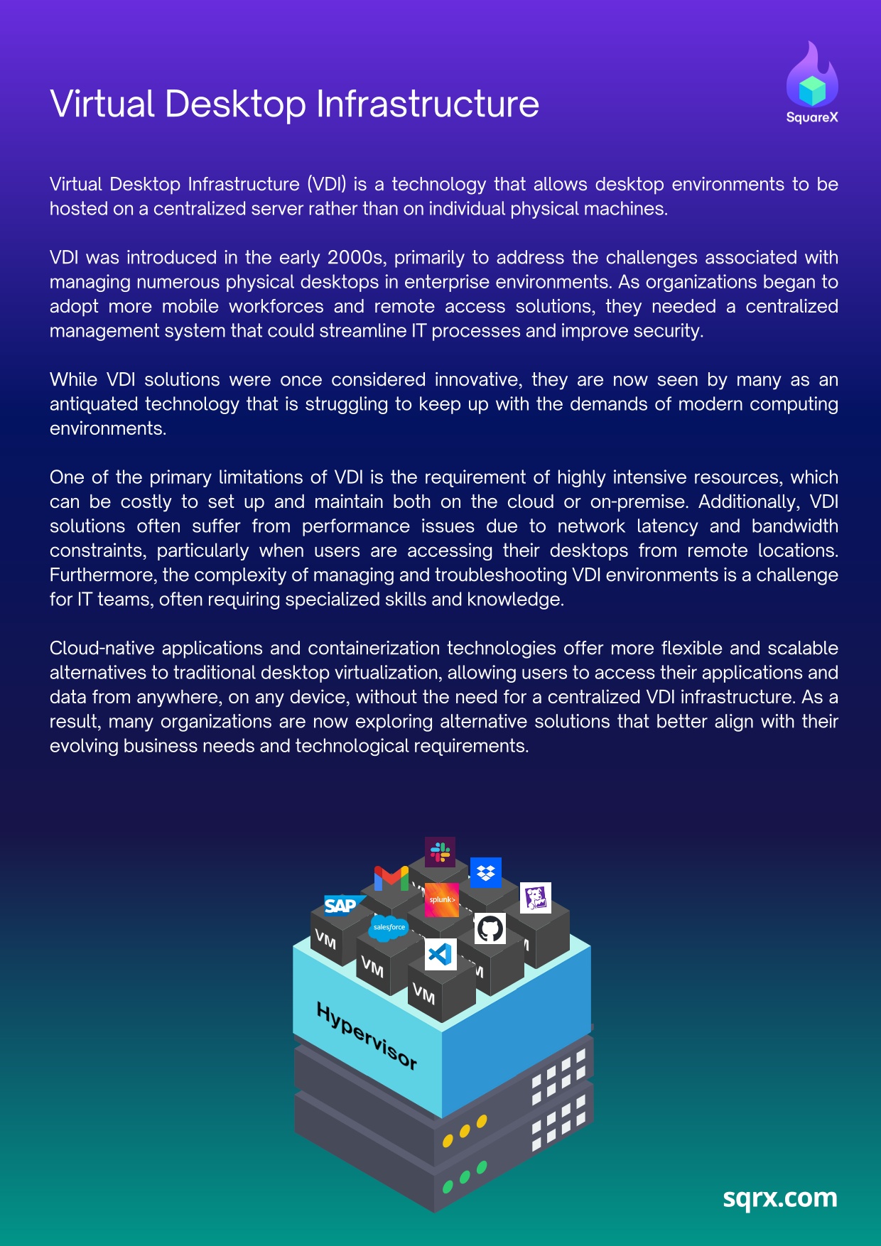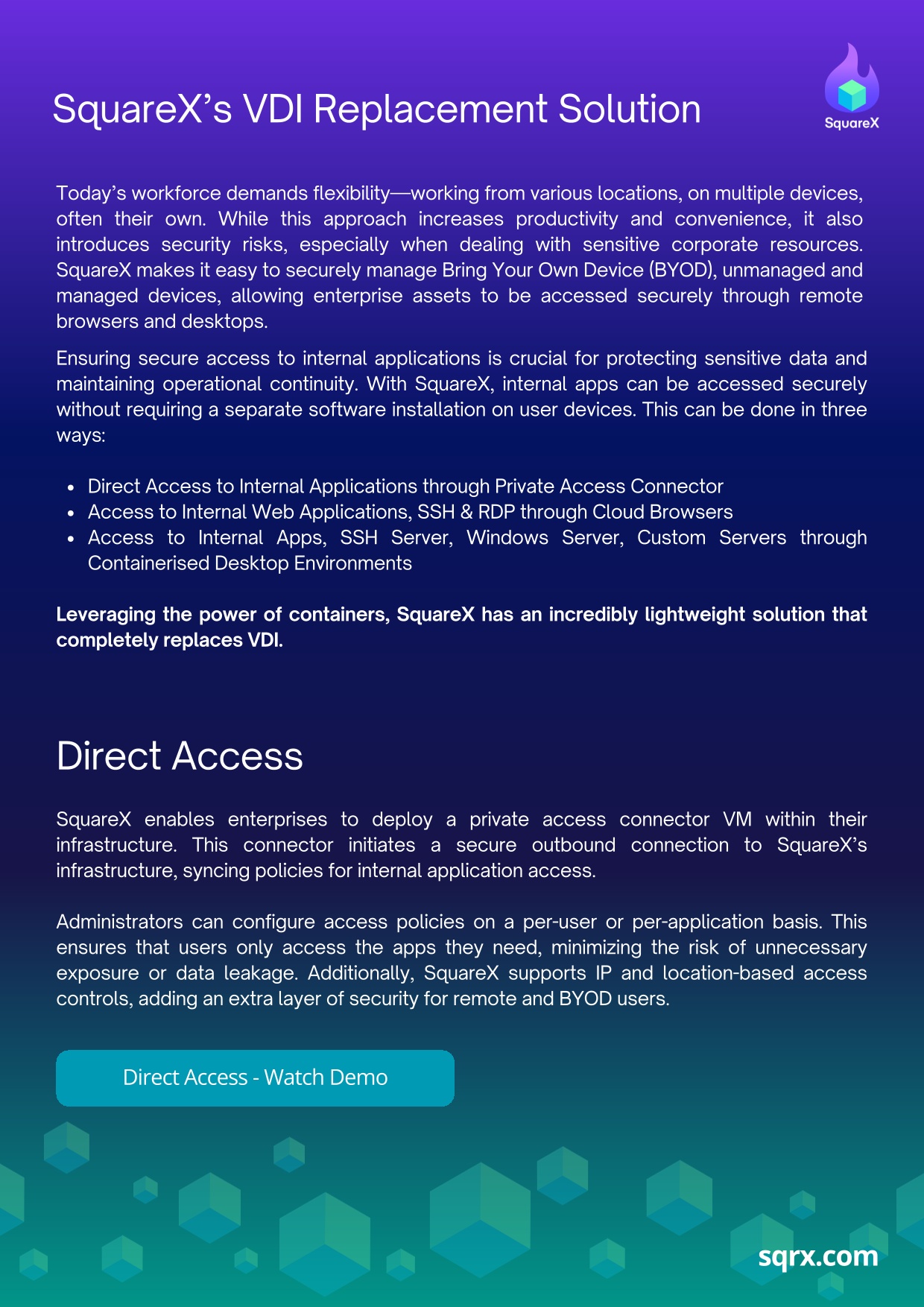But now, you can reap all the benefits of VDI without such cost. Leveraging the power of containers, SquareX has an incredibly lightweight solution that completely replaces VDI. With SquareX, internal apps can be accessed securely without requiring a separate software installation on user devices.